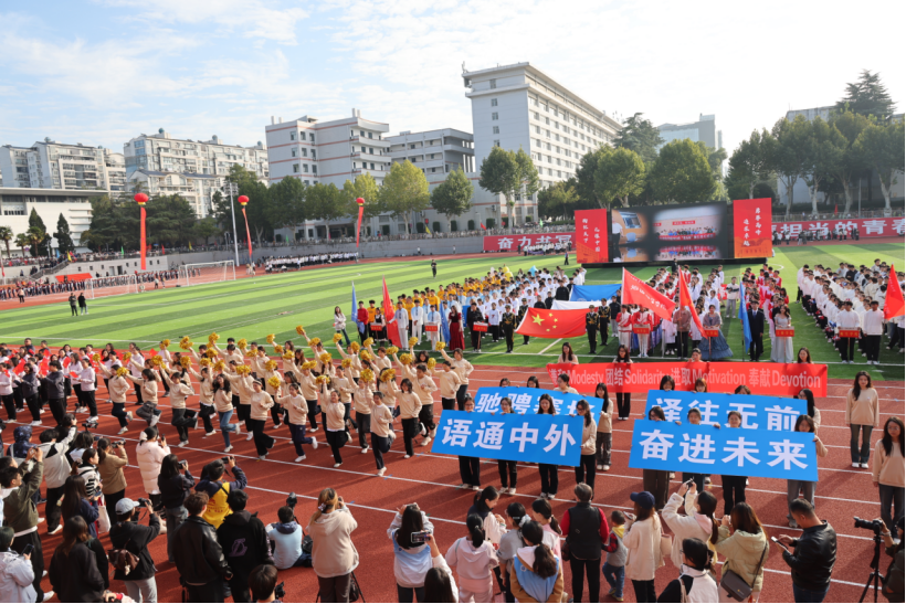 “语通中外,奋进未来,驰骋赛场,‘译’往无前”,3044永利集团师生方阵踏着《运动员进行曲》的鼓点亮相赛场,他们整齐划一,口号嘹亮,表演环节,师生健儿们热情活泼、协同演绎,本科生方阵用青春活泼的舞蹈表演搭配研究生方阵手持展板彰显外语人的“谦和、团结、进取、奉献”的院训精神,让外语人昂扬亮丽的青春风采闪耀赛场。