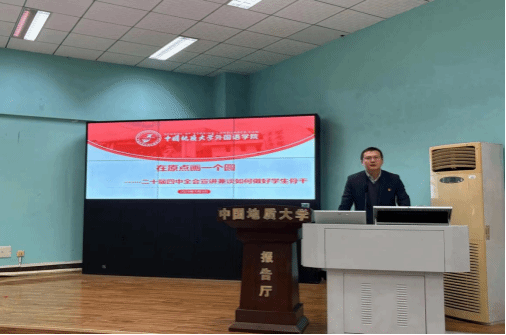 为深入学习贯彻党的二十届四中全会精神,落实习近平总书记关于青年工作的重要思想,11月3日晚,2025-2026学年“语翼”团校开班仪式暨团校第一课在北一楼报告厅举行。校团委副书记刘明辉、外国语公司党委副书记余尚蔚,分团委书记邹蔚鹤、辅导员黎颖、兼职辅导员单丹及189名学员参加。邹蔚鹤主持开班仪式。