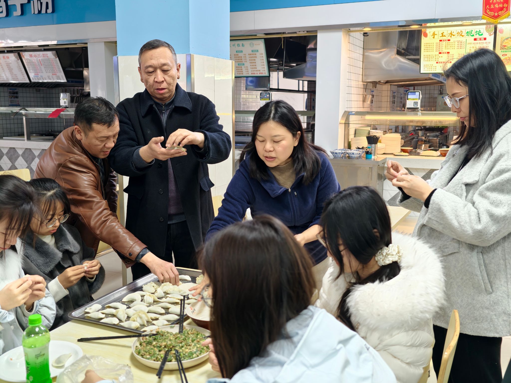活动开始,同学们齐聚北区食堂,老师们围在餐桌前,手把手分享技巧:如何恰到好处地放馅料,如何捏紧饺子皮,如何包出漂亮的饺子褶......在轻松愉快的氛围中,大家边包边聊,老师们不仅关心同学们的手艺进展,更细心询问大家的近况——学习上是否有压力,生活上是否适应,假期过得如何……一句句贴心的问候,让热闹的活动现场多了一份家的温暖与安心。